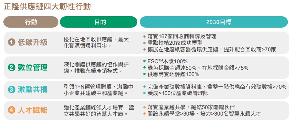 洞見零碳經濟下的關稅風險及產業契機,2023年正隆即著手打造產業碳數據資料庫,攜手20家產業鏈夥伴,組建造紙業首例碳中和聯盟,並完成台灣首例工業用紙碳足跡盤查,每年達成減碳效益近12,000公噸、節省超過5,500萬元的能源成本。2024年,更創建「正隆iPAS工控資安暨智慧製造供應鏈專班」,完備工控資安人才庫,強化紙業數位及風險管理韌性。正隆張清標總經理強調:「永續不能單打獨鬥,重視在地供應鏈ESG競爭力,正隆持續深化供應商議合行動,確保正隆供應鏈的低碳產品,在淨零趨勢下始終為全球大廠的優先選擇。」為加速推動造紙產業升級低碳智慧製造競爭力,正隆聚焦300家關鍵供應鏈夥伴的「淨零『智』造:淨零轉型、智慧製造」雙軸轉型,並提出四大永續韌性行動,以及超過15項行動目標。正隆供應鏈四大韌性行動