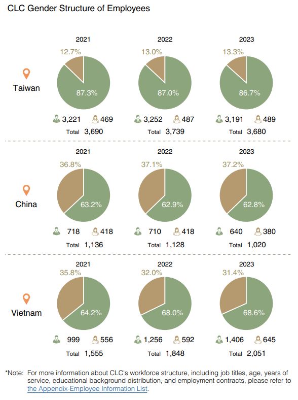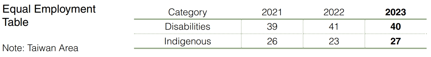 We followed the "People with Disabilities Rights Protection Act" and "Indigenous Peoples Employment Rights Protection Act" and hired 40 persons with disabilities and 27 indigenous people. In order to promote multiple employment, we have set up the "Bonus for Indigenous Long-term Employment". In 2023, a total of 24 eligible colleagues have applied. Not only do we encourage the indigenous peoples to work in CLC, but also hope that employees can serve for a long time. In terms of workforce composition, most CLC employees are Taiwanese, and we prioritize employment for local residents at individual production bases. Besides creating local job opportunities and stimulating domestic economic development, this policy also helps stabilize workforce. To ensure the well function of production line, we only hire a small number of foreign workers for the vacancies that cannot be filled by local citizens.