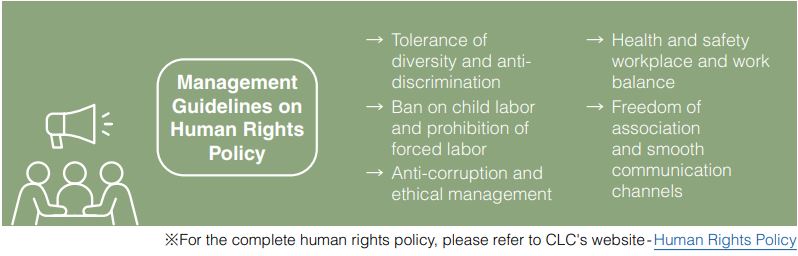 The Company's business bases in various places strictly abide by local labor regulations, are committed to protecting the basic human rights of all employees, and support and declare to the basic spirit of international conventions while formulating CLC's human rights policy in accordance with their guiding principles, so that all relevant people can be treated fairly and with dignity, including "tolerance of diversity and anti-discrimination, ban on child labor and prohibition of forced labor etc."