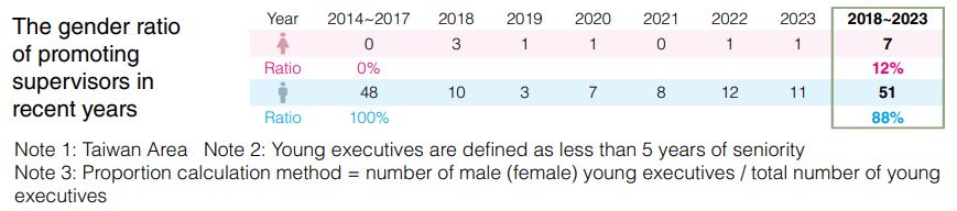 As the paper industry is one of the traditional manufacturing industries dominating by male employees in the past, most members of the junior management are male, resulting in a ratio of about 10.9:1 in terms of male and female. There are 404 team or group leaders in Taiwan in 2023. For employees with seniority below 15 years, it takes about 7 years to become a team or group leader. Due to the transformation into a service industry and valuing innovation, younger people have been promoted to the junior management in recent years. We also actively promote the training plan, and optimize the management organization. Following the rise of equal opportunity in employment, since 2018, 46 employees with less than 5 years of seniority have been promoted to junior management positions, with 13% of them being female. This represents a significant change from the period of 2014 to 2017.
