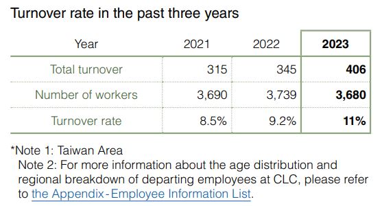 Suitable personnel turnover is necessary for enterprises to pursue sustainable development. In recent years, apart from maintaining a 10% reasonable turnover rate, we constantly recruit new employees to bring in vitality and diversify. In 2023, a total of 406 employees or 11% resigned, in terms of gender among all employees, 11% were male and 10.6% were female. In view of the increasing trend of aging retirees in recent years and the overall labor shortage in the market, our company will continue to participate in employment fairs across various regions, deepen industry-academia cooperation, and recruit new employees.