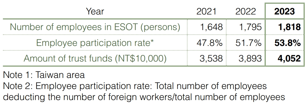 To share our business performance results and encourage employees to develop saving habits, CLC has been a pioneer in the industry by promoting the "Employee Stock Ownership Trust (ESOT)" since 1998. Employees are encouraged to voluntarily allocate a certain amount to a trust account each month, with we contributing an additional 40% of the employees' contributions to the account for the purchase of CLC stock. Over the years, the participation rate in the ESOT has exceeded 40%. In 2023, the voluntary participation rate reached 50%, an increase of 2.1% from the previous year, with the subsidy amount reaching NT$40.52 M. Over the past 3 years, the total subsidy amount has reached NT$114.83 M.