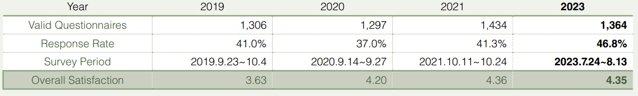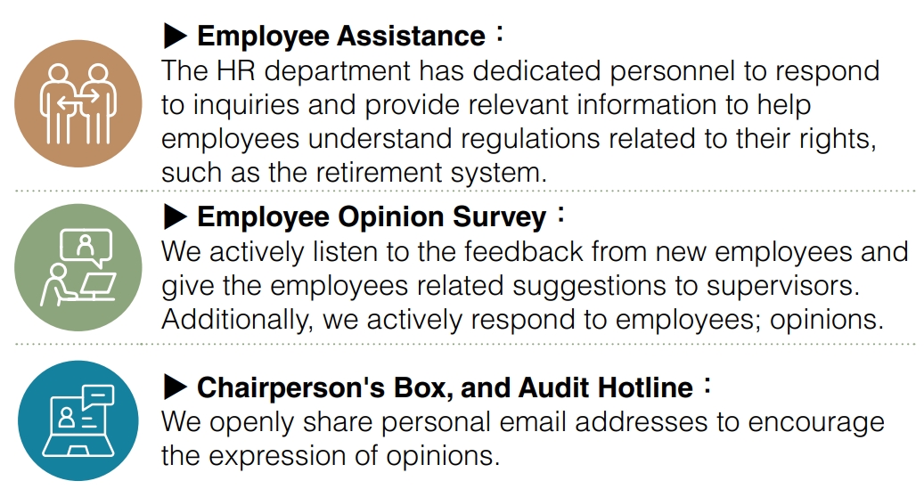 To enhance employees' sense of belonging and commitment to the organization, we value employees' feedback and collaborates with 104 Job Bank to conduct employee sentiment surveys. These surveys comprehensively collect employees' opinions and assess the appropriateness of strategic regulations. Based on the survey results, we take improvement measures and will continue to conduct surveys periodically to keep listening to employees' voices.