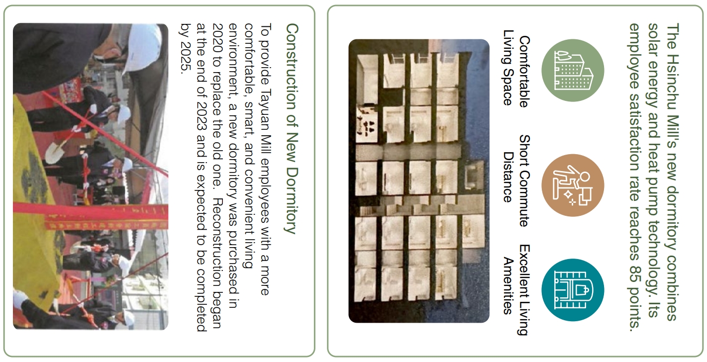 ✓Work Environment: Built new dormitories at the Hsinchu Mill, Chubei Mill, Tayuan Paper Mill, and Tayuan Plant; continuously upgraded equipment to provide a comfortable office environment.
