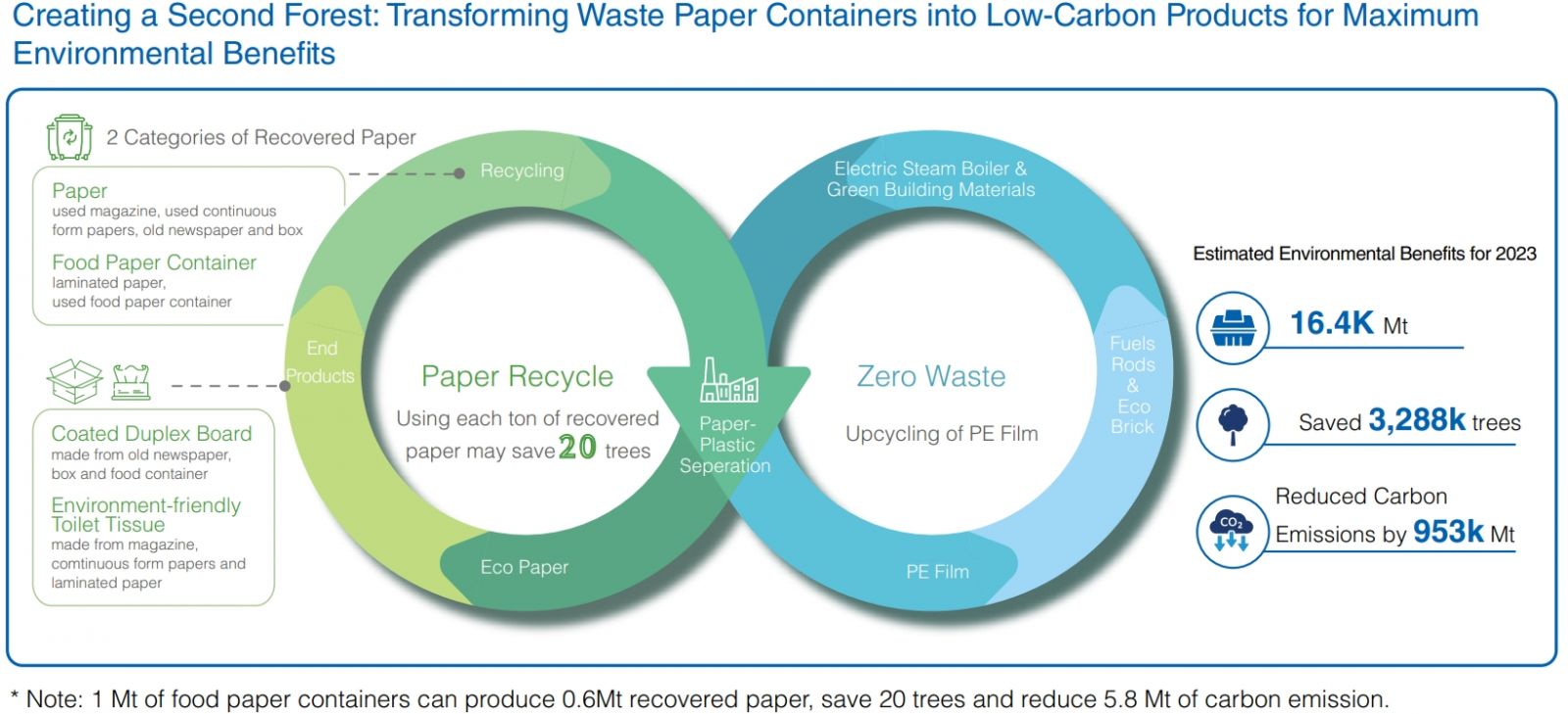 To tackle the problem of waste food paper container disposal, we also believe that it is responsible for papermakers' responsibility to engage in recycling waste food paper containers. Therefore, we made advanced deployment by investing a “efficient film laminated paper treatment system” in 2018 to become the 1st company completely recycling food paper containers. In same year, started the “upgrading of recovered paper supply chain plan” and deepen the benefits of the circular economy. We supported over 167 recovered paper suppliers in Taiwan to upgrade. Reduced paper sludge by 50% and decreased the energy consumption by 10% by implementing source identification, and enhanced the profit and competitiveness of recovered paper supply chain. The plastic laminate is recycled into green fuel and eco-friendly building materials products. Pre-planned to help solve the growth of the take-out catering culture was driven by the epidemic and respond to the stop using plastic bottles policy in Taipei in 2022 to realize benefits with a creative multi-win sustainability business model. With the goal of continuously deepening the recycling efficiency, the recycled bleached pulp line of Tayuan Mill, which will operate in 2023H1.