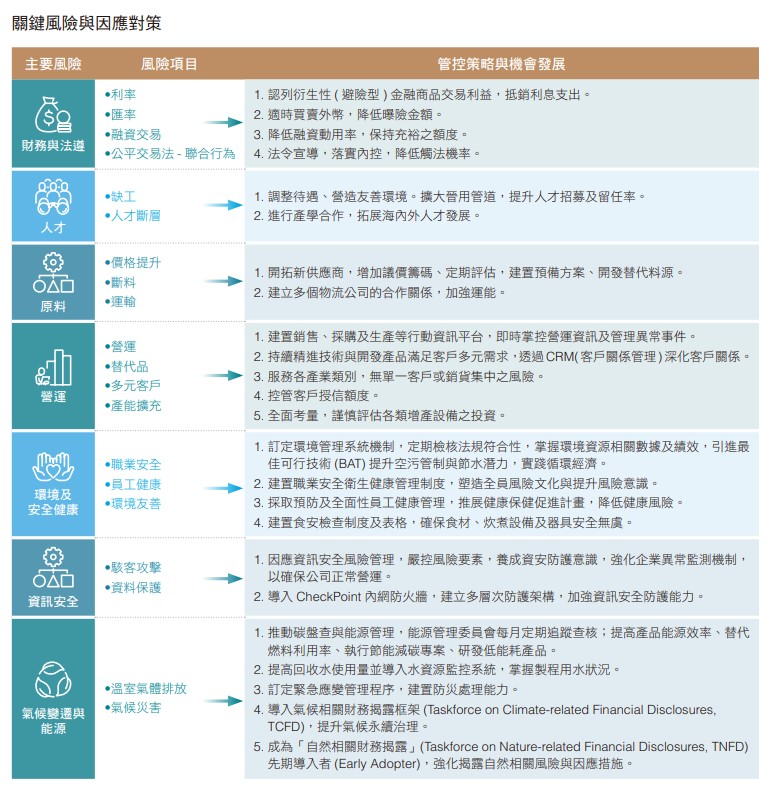 ● 策略:營造重視風險管理之經營策略與企業文化,強化風險管理作業以提升營運透明度及保障員工、股東之權益。