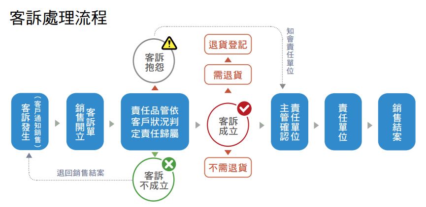 為有效解決客戶抱怨及處理客戶退貨事宜,本公司設有完善的管理機制與客訴處理流程,由品管人員和相關同仁負責與客戶溝通並判定分析客訴異常情況,生產與相關責任單位則會針對異常發生原因進行分析探討,並提出回饋與改善預防對策,防範相同錯誤再次發生。正隆的客訴處理流程皆已電子化,除提升客訴處理效率,資料紀錄亦可進行數位化保存管理以提升服務品質。