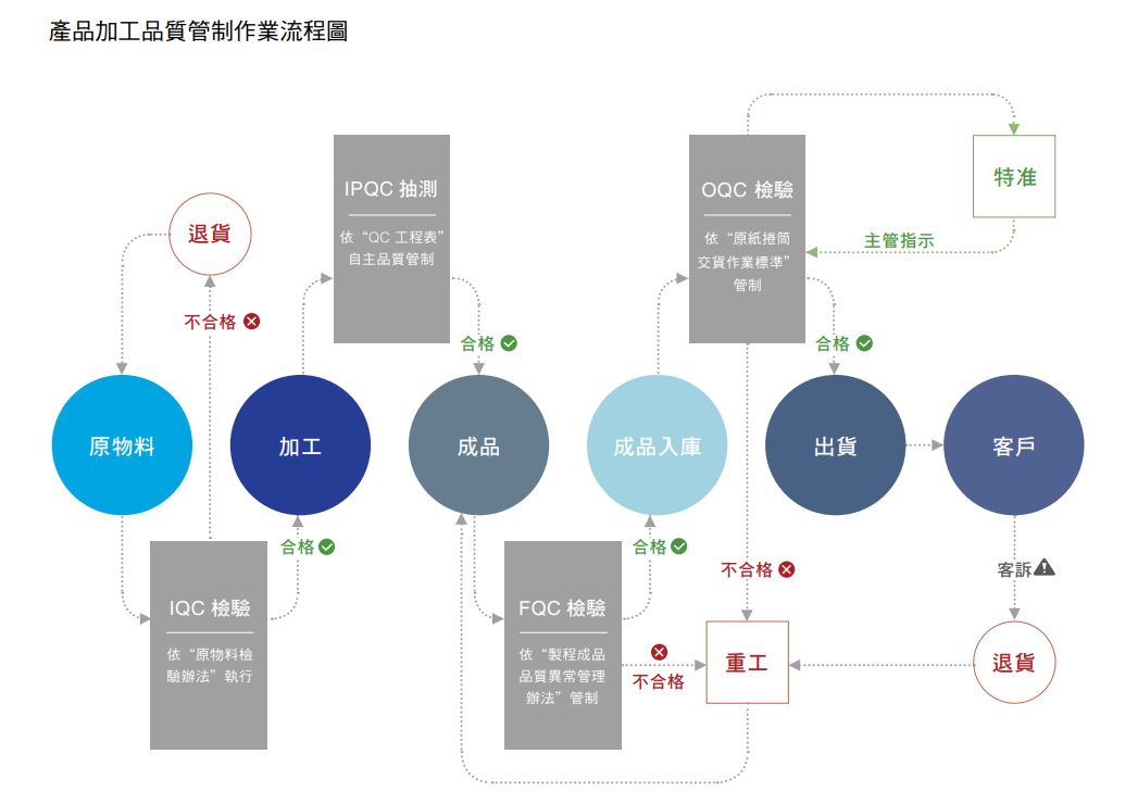 正隆以工業用紙為主要產品,並嚴格把關產品安全性,從原物料採購、生產製造到產品出貨,全程皆訂有完善的管理規範,執行面也嚴謹確實。原物料方面,設有專職IQC(Incoming Quality Control)進行定量抽樣檢驗並依照合格頻率調整抽樣次數,且逐漸朝向以供應商管理、提供有害物質檢測報告來取代進料檢驗,若檢驗出不合格,則調整為每批次抽驗以確保物料的品質安全。產品生產與出貨過程中,採用生產、發貨人員自主品質管理,以即時掌握製程品質;專職品管人員則依規定頻率進行成品與入庫出貨的品質檢測,在現場與品管人員的雙重把關下,確保送到客戶手中的產品品質合格且良好。