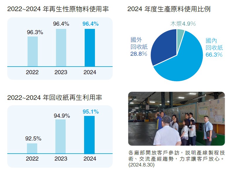 ▸ 再生性原物料使用率96.4%:使用國內回收紙約115.5萬公噸、國外回收紙54.5萬公噸,原生木漿近8.6萬公噸,以及其他植物性原料如澱粉、樹薯粉等,合計使用174.6萬公噸再生性原物料;非再生性原物料包含造紙添加化學藥劑等,約為6.6萬公噸。