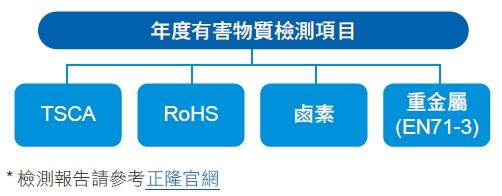 因應REACH(SVHC)檢測項目從16項逐年增加至242項(年增7項),為確保檢測效率與即時滿足客戶需求,本公司於2021年起導入FMD(Full Material Declaration)全物質宣告源頭管理系統,取代成品檢驗報告,除了減少資源浪費,更提升對有害物質的管控能量。目前規範供應商定期提供原物料有害物質檢測報告,確保原料在投入生產時不含有害物質,2024年共有28家提交報告。