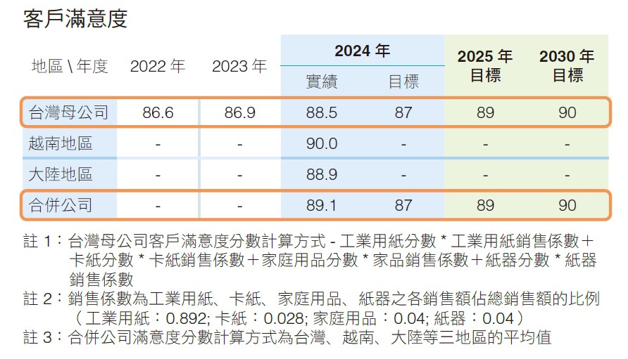 正隆建立完善的客戶管理制度,每年進行滿意度調查,針對低分項目採取改善措施,持續強化客戶服務。鑒於越南為海外發展重點,台灣成熟的調查制度也同步推展至其他海外廠部,2024年起增訂「合併公司」客戶滿意度之中長期目標,分別為:2030年客戶滿意度90分(台灣母公司、合併公司)、2025年客戶滿意度89分(台灣母公司、合併公司)。2024年,台灣母公司客戶滿意度為88.5分(目標 87 分);海外部分,越南地區客戶滿意度為90分,大陸地區客戶滿意度為88.9分;總計合併公司客戶滿意度為89.1分(目標87分)。未來,公司仍將持續透過強化客戶服務、落實生產績效與導入數位管理,致力達成所訂定的客戶滿意度目標。