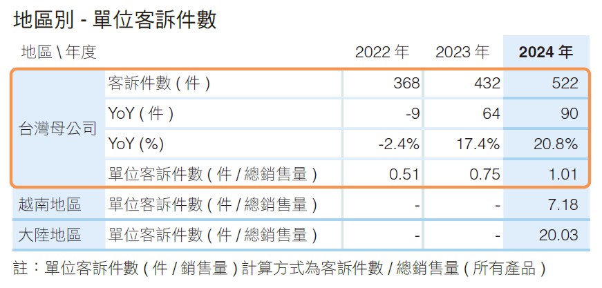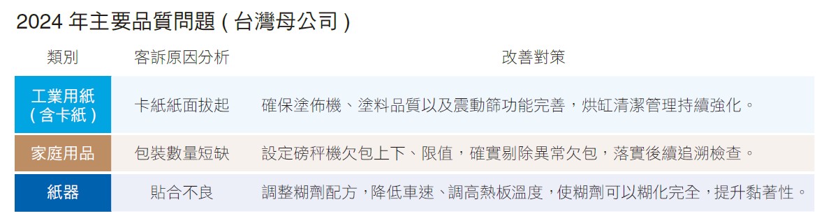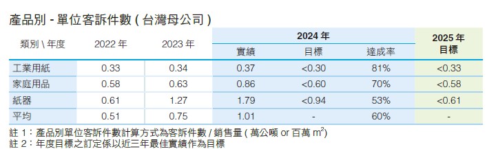 在客訴管理上,正隆台灣母公司訂定2024年產品別單位客訴件數管理目標,分別為:工業用紙<0.30 件 / 萬公噸、家庭用品 <0.60 件 / 萬公噸,以及紙器 <0.94 件 / 百萬 m2 。達成狀況為:工業用紙目標達 成率 81% ( 平均 0.37 件 )、家庭用品 70% ( 平均 0.86 件 )、紙器 53% ( 平均 1.79 件 ),整體達成率為 60%。其中,2024 年客訴件數共有 522 件,較前一年度增加 90 件;客訴件數增多以及產品別單位客訴 件數未能達標主因為卡紙紙面拔起、家庭用紙包裝數量短缺,與紙器貼合不良等因素。海外越南方面, 工業用紙單位客訴件數為 0.14 件 / 萬公噸,客訴原因多為原紙摺痕;紙器單位客訴件數為 14.21 件 / 百 萬 m2 ,原因主要為翹曲。大陸部分,紙器單位客訴件數為 20.03 件 / 百萬 m2 ,主要為印刷不良。