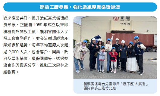 每一張紙都是樹木的延伸,回收紙可以創造二次森林。深信基礎教育是促使資源正確循環再生的動力,正隆積極呼應聯合國SDGs 4優質教育願景,自2014年起在全台打造「紙圖書館」,為偏鄉注入閱讀與環教資源,讓師生得以透過閱讀、認識與接觸紙資源,學會守護與珍惜環境的美好。近年來,正隆積極透過串接多方利害關係人,以共創紙圖書館、推動永續教師研習營、開放工廠參觀等多元創新模式,為社會扎根二次森林永續價值。