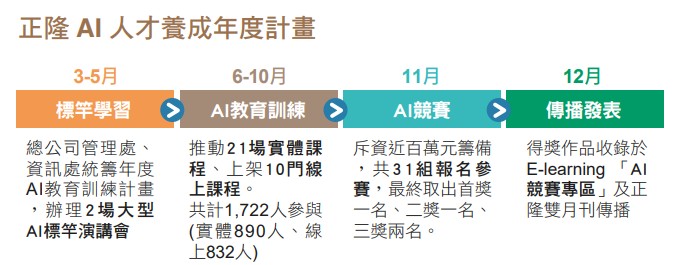 2019年,正隆啟動「智紙4.0」,成為台灣首家導入產銷智能化的紙業公司,逐步實現低碳轉型。面對全球AI技術的快速發展與不斷變化的永續趨勢,正隆將2024年定位為AI應用元年,不僅自建GPT系統以提升行政管理效率與人資服務品質;更於製造端回應工業4.0政策,全面推動智慧工廠轉型,提升設備整合效率、強化節能減碳監測,更以自動化管理降低人力依賴,回應傳統產業長期的人力結構問題。於公司治理面向,則強調「學習與應用」,2024年規劃涵蓋基礎至進階的AI應用領域的課程與講座,共計開辦9門、21場實體教育訓練及10門線上課程,號召台灣區近5成(共計1,722名)員工接受培訓,全面提升同仁對AI技術的理解與應用能力。此外,為了進一步深化學習成果,正隆亦舉辦「AI應用競賽」,吸引31個團隊踴躍參賽,幫助員工將AI技術融入日常實踐,促成跨部門合作,也由良性競爭增強價值認同與成就感,提升企業留才率。首獎團隊將AI應用於經營報告製作,提升工作效率達3倍;二獎團隊以AI展示四個構面的生產效率改善;三獎團隊則運用AI解決造紙機的文件管理、建立安衛證照搜尋自動化功能。未來,正隆將持續加大對AI教育與應用的投入,以長期的智慧化發展奠定低碳產銷的堅實基礎。