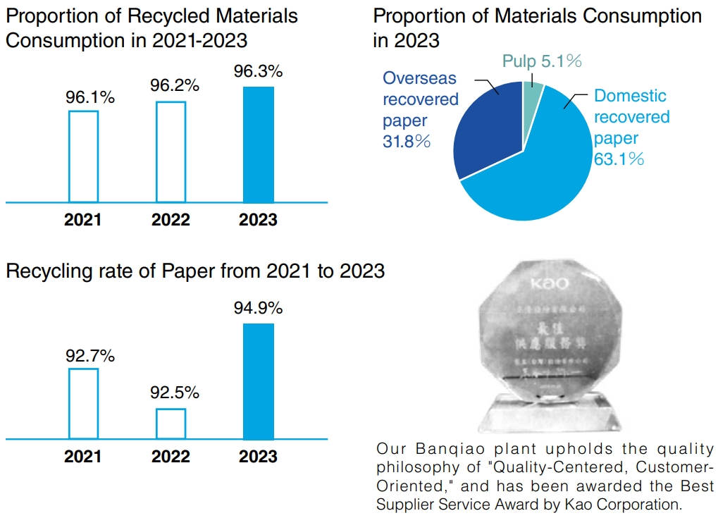 In response to the sustainability trend, we have been using recovered paper as the main raw material for a long time to preserve forest resources and reduce carbon emissions. We also procure sustainably managed forest pulp, demonstrating our commitment to forest conservation. In 2023, FSCTM certified pulp accounted for 98.1% of the total virgin wood pulp procurement, a 5.4% increase from the previous year. Other results are as follows: