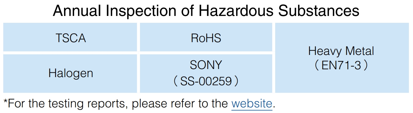 Every year we send products to the SGS laboratory to test for the content of hazardous substances according to the EU testing items and specifications, such as the EU's REACH, SVHC, and RoHS of the EU; Sony's Environment-related Substances to be Controlled (SS-00259); halogen content specifications; and the EU Standard EN 71-3 heavy metal safety requirements for toys. In 2023, CLC products passed all regulatory requirements and conformed to customer requirements.