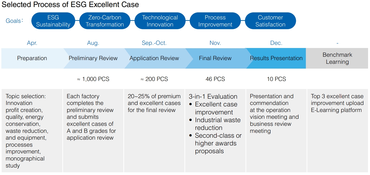 ❙ Encouraging the employees to figure out the problems with the excellent cases management system, Brain-storming the ESG innovative casesSince 1980, CLC has introduced proposal improvement systems, QCC, and TPM. In 2008, we launched an activity integrating evaluation and rewards, focusing on process enhancement, technology development, green energy innovation, and customer service. This initiative channels carbon reduction suggestions from frontline manufacturing to senior management. Recently, in response to ESG transformation, CLC has used competitions to motivate employees to identify issues, fostering healthy competition and enhancing problem-solving and innovation. Since 2021, ESG improvement activities have extended to overseas locations, encouraging continuous innovation and optimization.